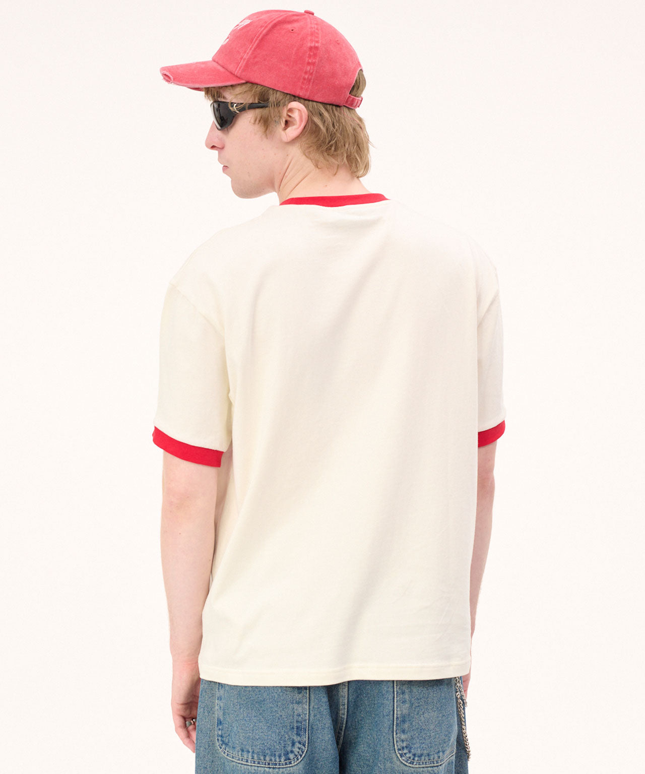 - Kontrastfarbiger Kragen und Ärmel (rot)