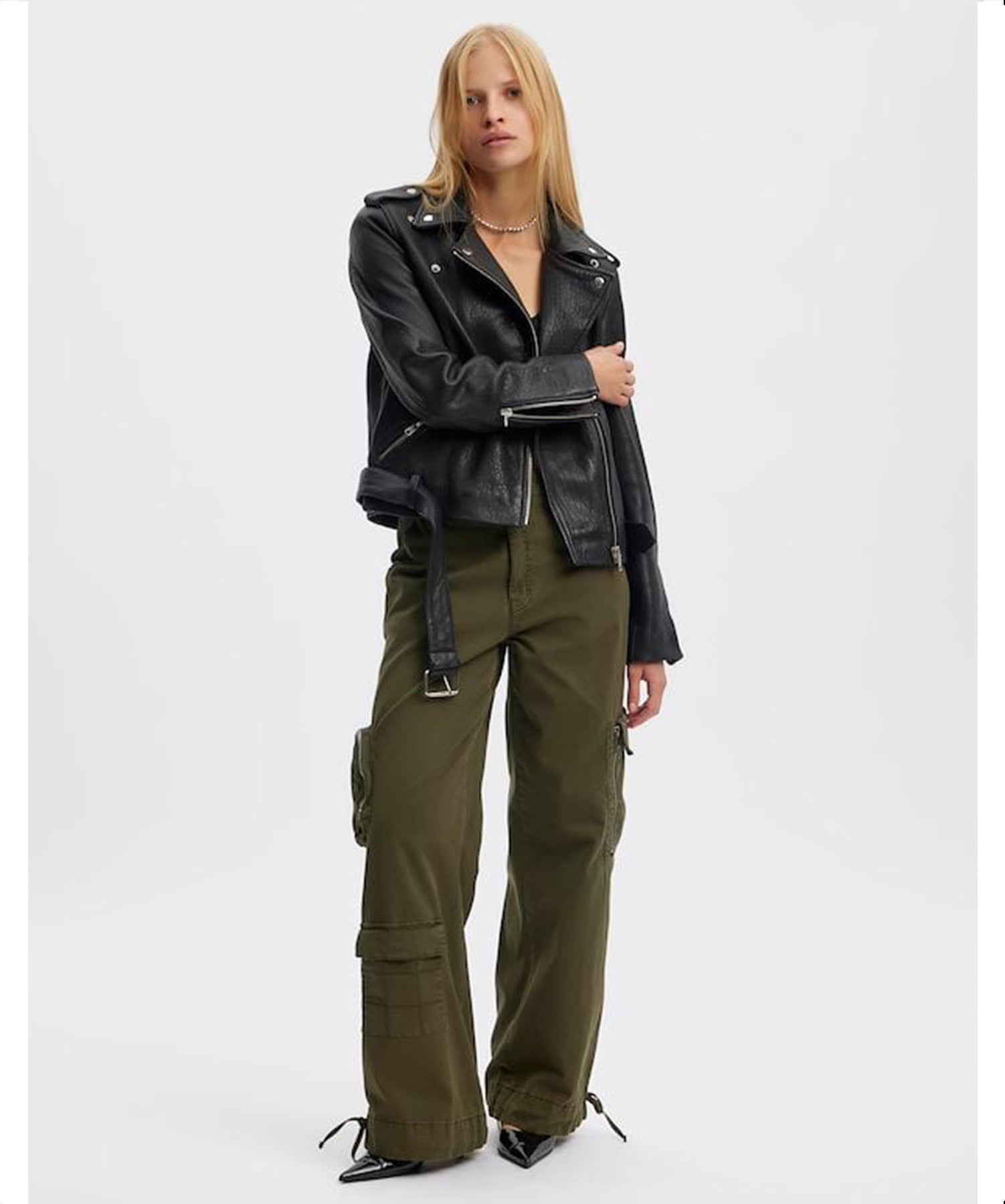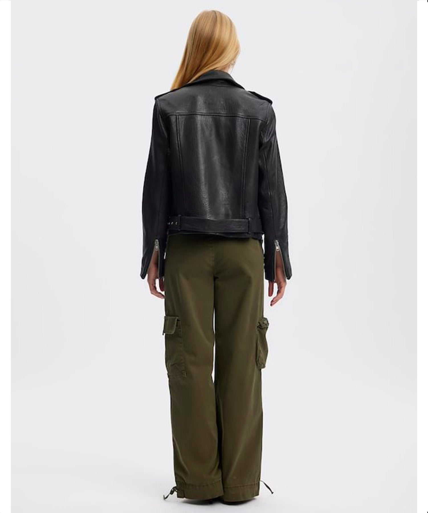Eine coole und klassische Bikerjacke aus 100% Lammleder. Das klassische Design umfasst ein gekerbtes Revers mit Druckknöpfen und einen dezentralen Reißverschluss. Die Jacke verfügt über schräge Fronttaschen mit Reißverschlüssen, Ärmel mit Reißverschlussmanschetten sowie Laschen an den Schultern mit Druckknöpfen. Der angebrachte Gürtel am unteren Ende vervollständigt den Look.